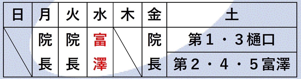 | お知らせ | NEW! 2026年4月1日から水曜の医師が変更となります。 院長から土曜に勤務されている富澤医師に変更となります。 |